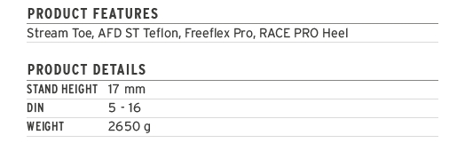 The Freeflex ST 16 binding features the Stream front and RACE PRO heel. The large adjustment range and aerodynamic design ensure safety and maximum performance.