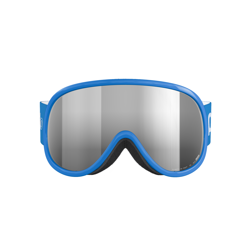 • POCito Retina kids’ ski goggles with Clarity lens, mirrored finish, UV400 protection, anti-fog coating, and silicone strap for helmet stability.
