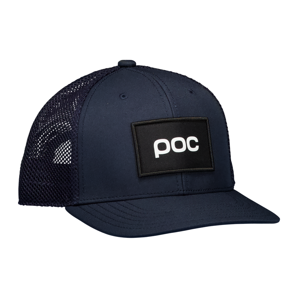 • POC trucker cap with mesh panels, wide brim, and woven logo. Adjustable buckle closure, polyester front.