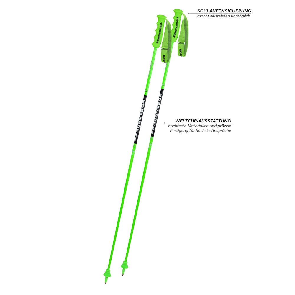 The carbon shaft, specifically designed for ski races, withstands high levels of stress while ensuring low weight and maximum performance. The race grip Duplo offers optimal grip and a confident hold, while the strap fastening mechanism makes tearing off the strap nearly impossible. The solid screw connection of the individual parts ensures a bomb-proof hold, and the tip and race basket are tightly glued together. This way, everything stays in place even when exposed to the high levels of stress occurring during ski races. Additionally, its distinctive green-black design makes it stand out from the crowd. This pole, combined with Worldcup equipment made of high-strength materials and carefully produced, is a must for ambitious racers who value top quality.